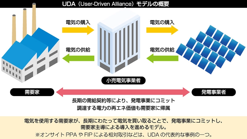 再生可能エネルギーを必要とする需要家のコミットメント(⻑期買取や出資など)の下で、再生可能エネルギー導入を進めるUDA (User-Driven Alliance)モデル(オンサイトPPAやFIPによる相対取引も含む)を推進します。